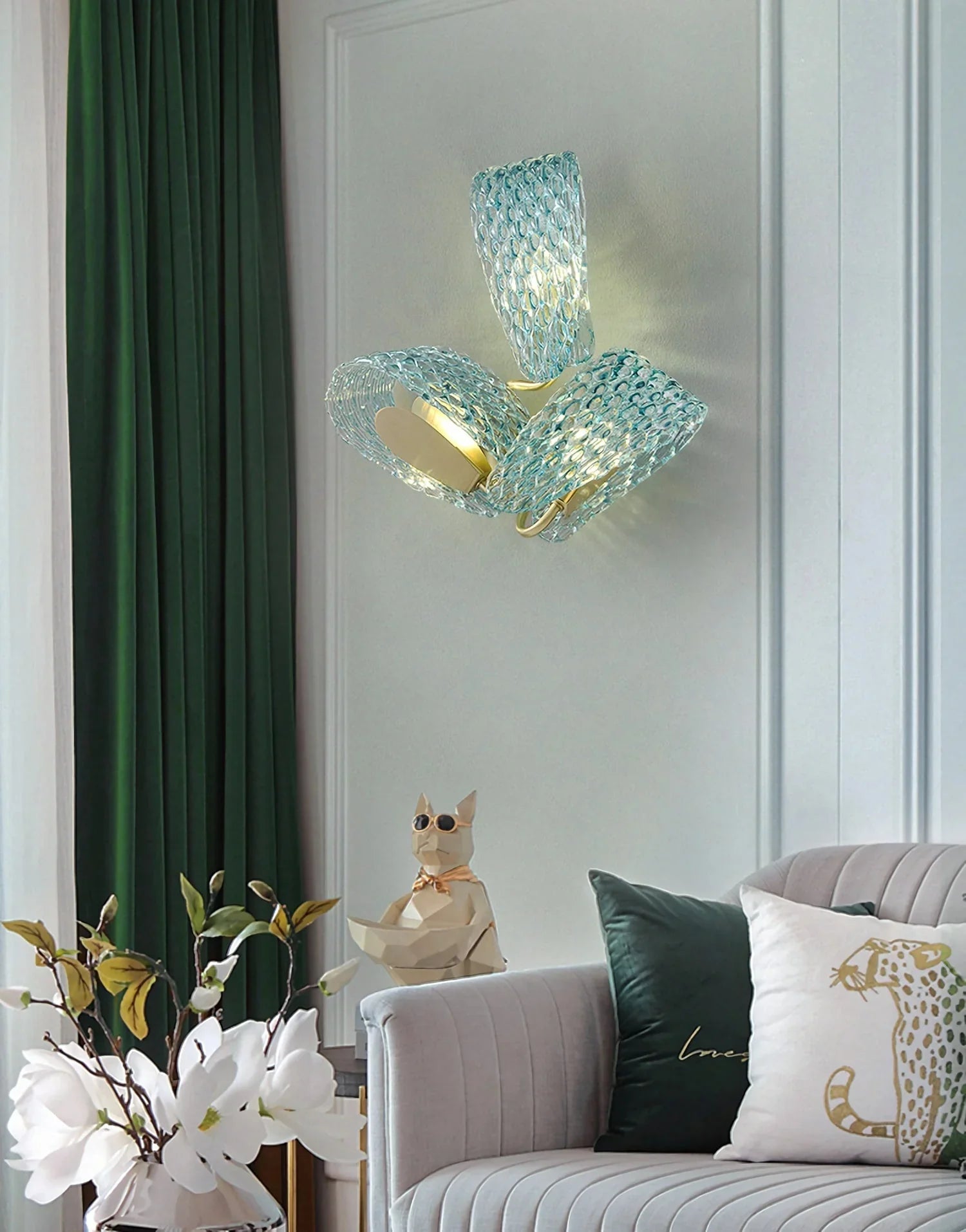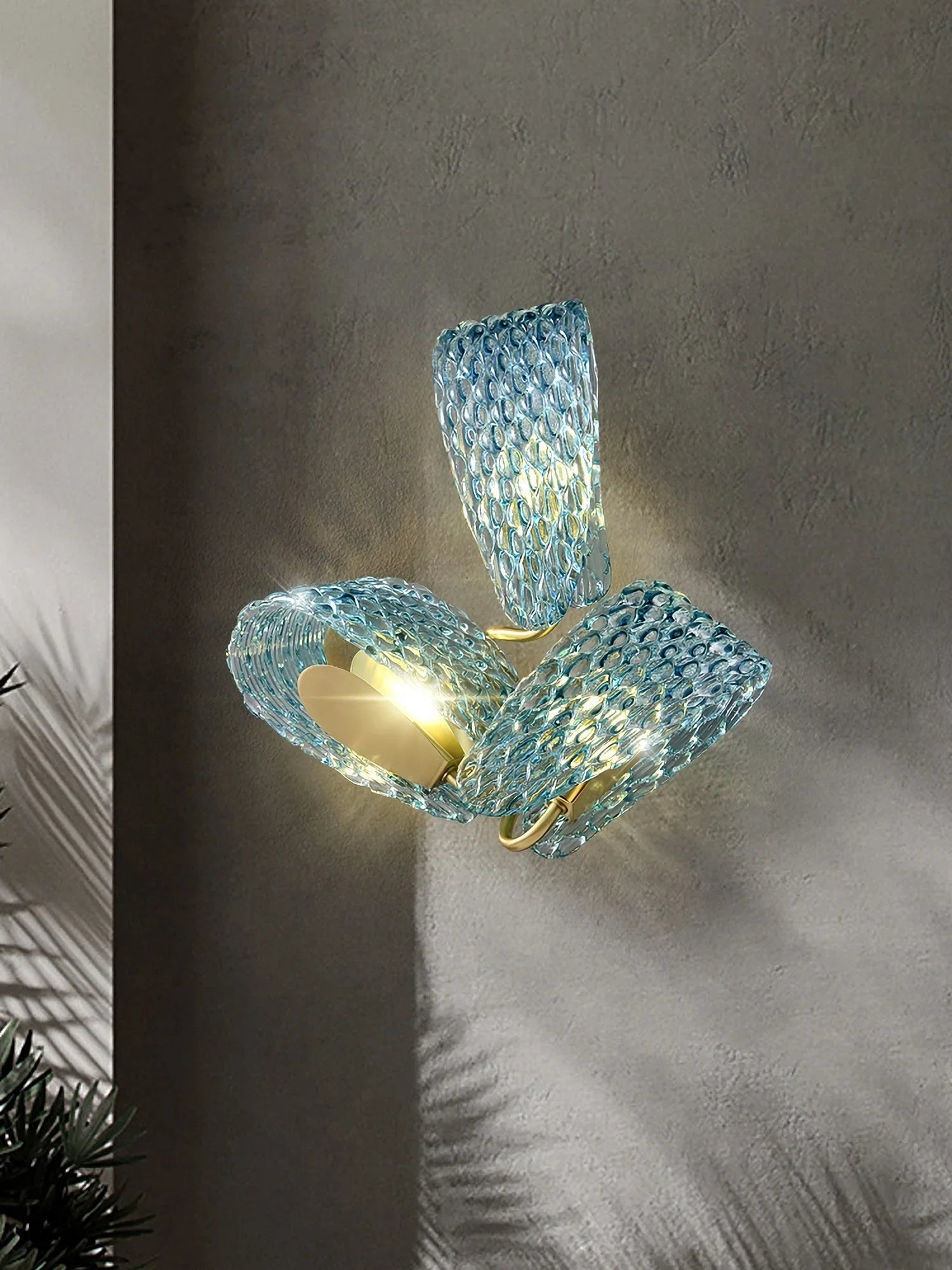 This Petal Blue Glass Wall Lamp is created with a copper body and a blue glass shade, featuring a beautiful petal design in blue and gold. The handcrafted piece exudes an air of mystery and elegance, with its unique bumpy texture that enhances the play of light and shadow. Experience unparalleled charm and elevate your lifestyle with this quality piece of art.