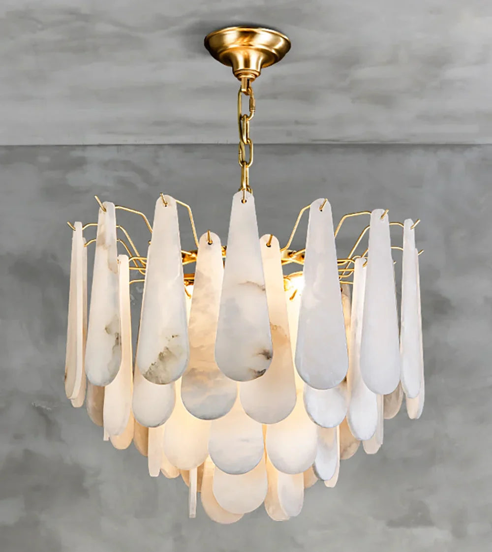 Introducing the Alabaster Leon teardrop chandelier - a fusion of elegance and organic forms. The white alabaster panels, each layer with a unique finish, contrast with the brass finish of the steel frame. Experience the classic beauty and striking finish of this chandelier.