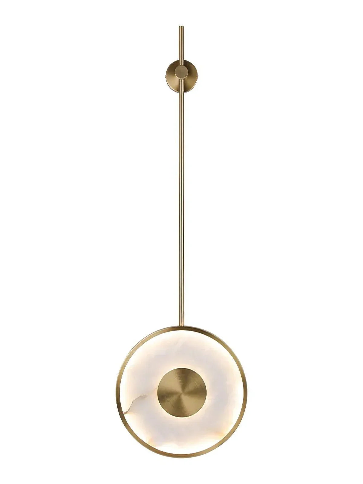 Behold the Alabaster Modern Round Strip Wall Lamp, a stunning blend of light and darkness, stone and metal. A perfect alignment of elements produces a mesmerizing effect - the subject, its crescent-shaped light center, and the metallic rim harmoniously fuse to create a radiant halo of light.