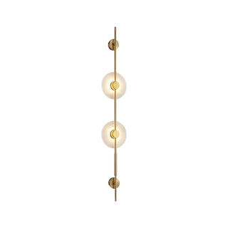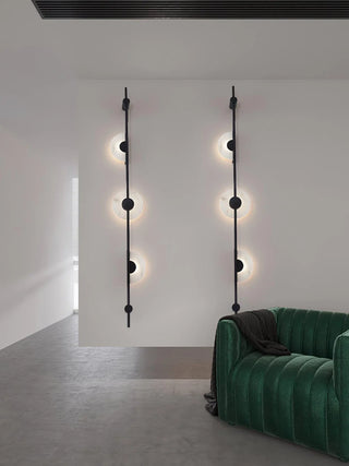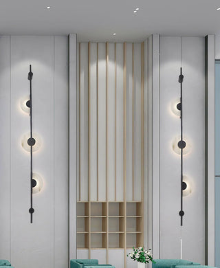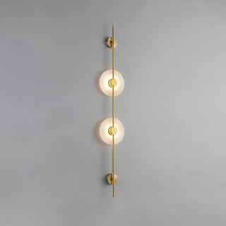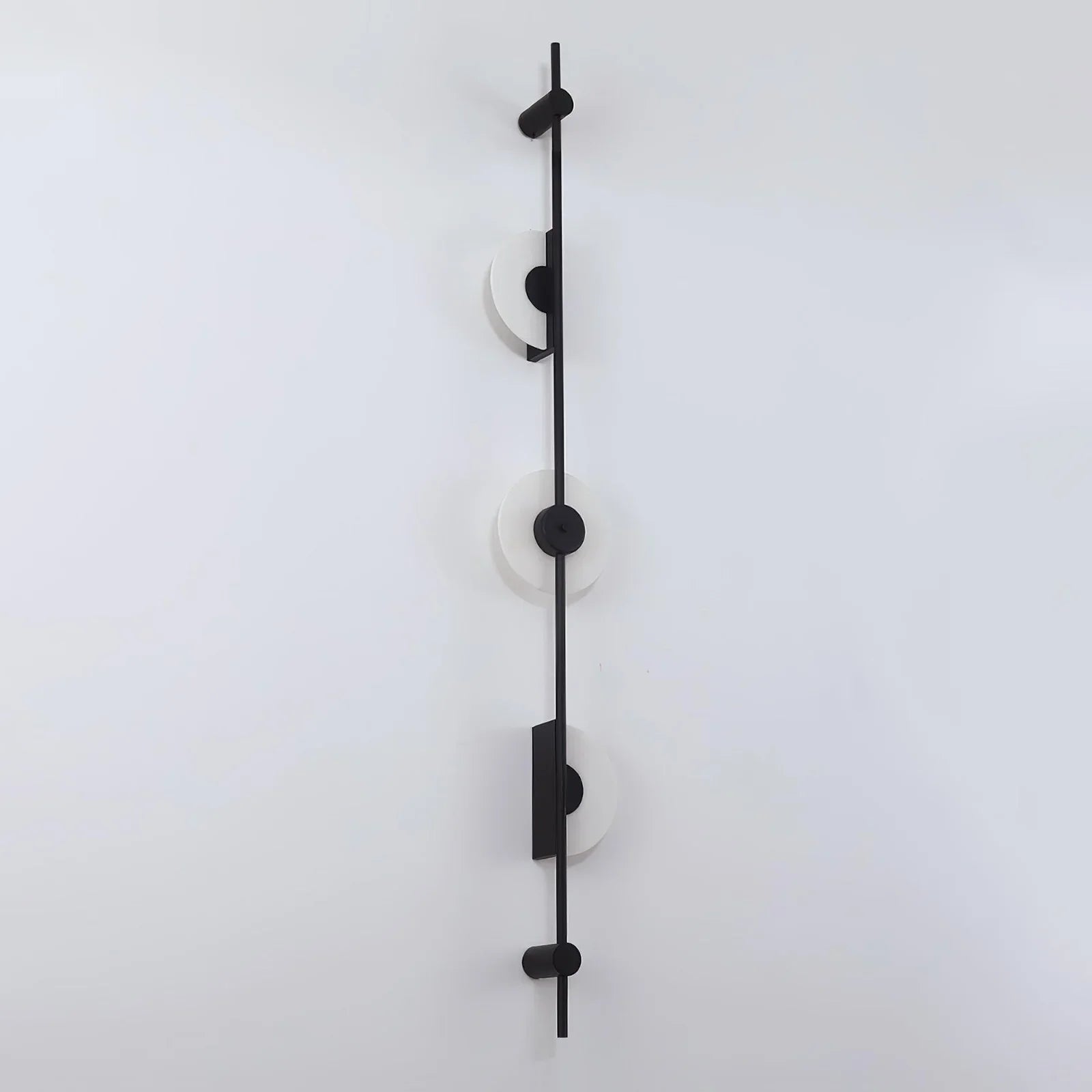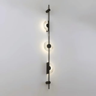 Experience the perfect blend of minimalist metalwork and soft, glowing alabaster with the Alabaster Vertical Wall Sconce. The sleek, vertical frame gracefully elevates elegant alabaster discs, each emanating a warm, inviting light. The natural veining and translucent quality of the alabaster adds a captivating visual texture, creating a stunning contrast with the clean lines of the metal structure.