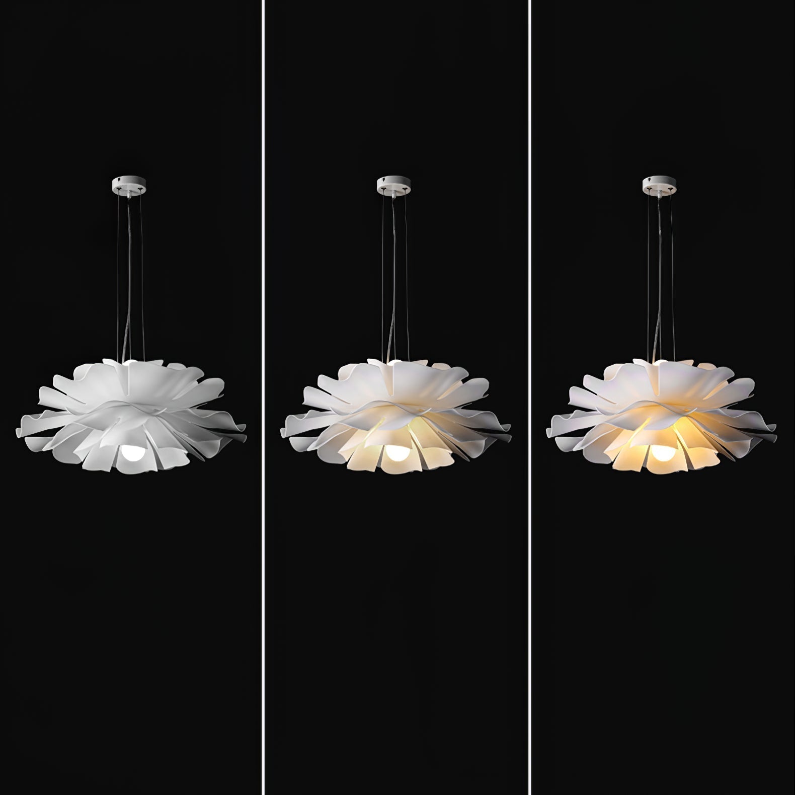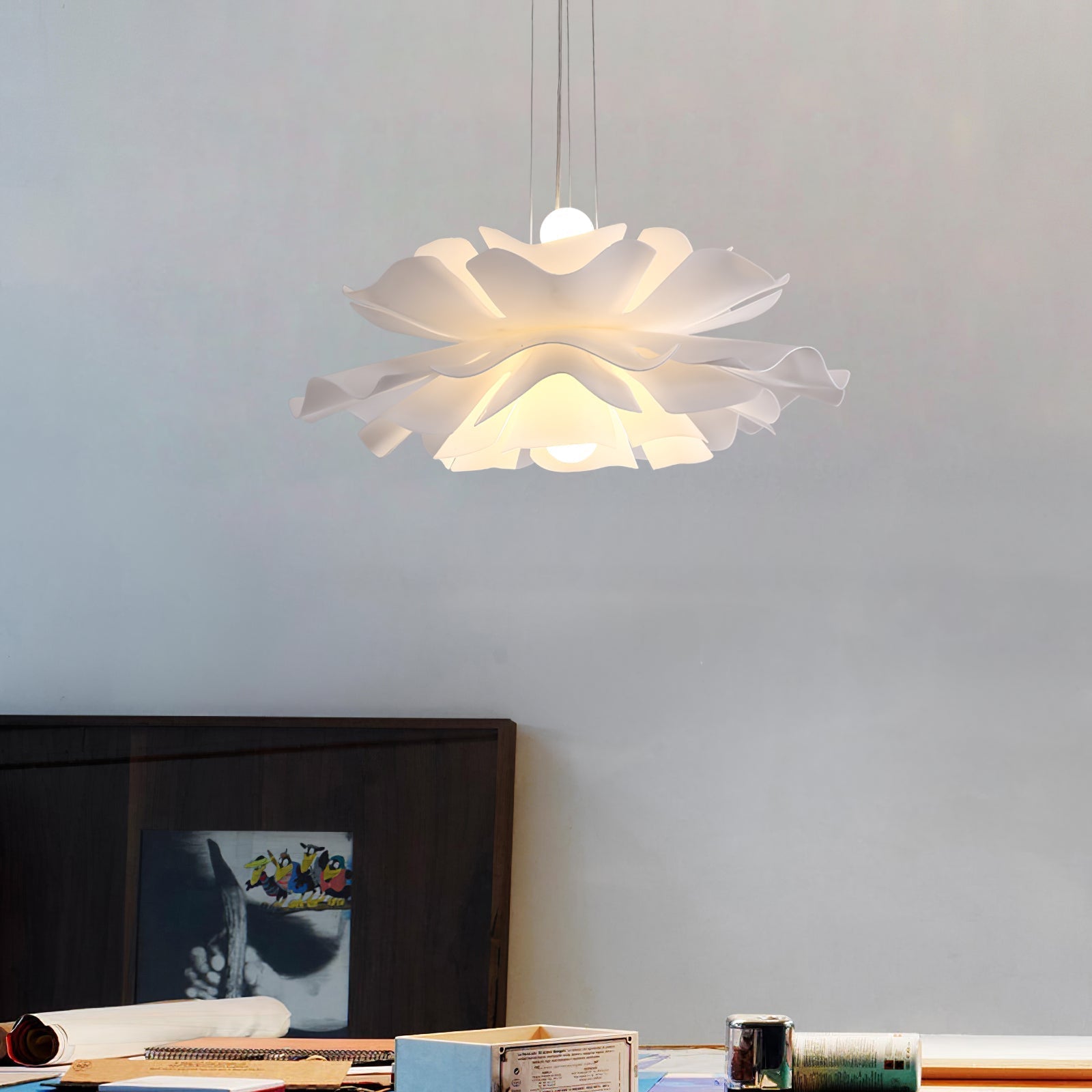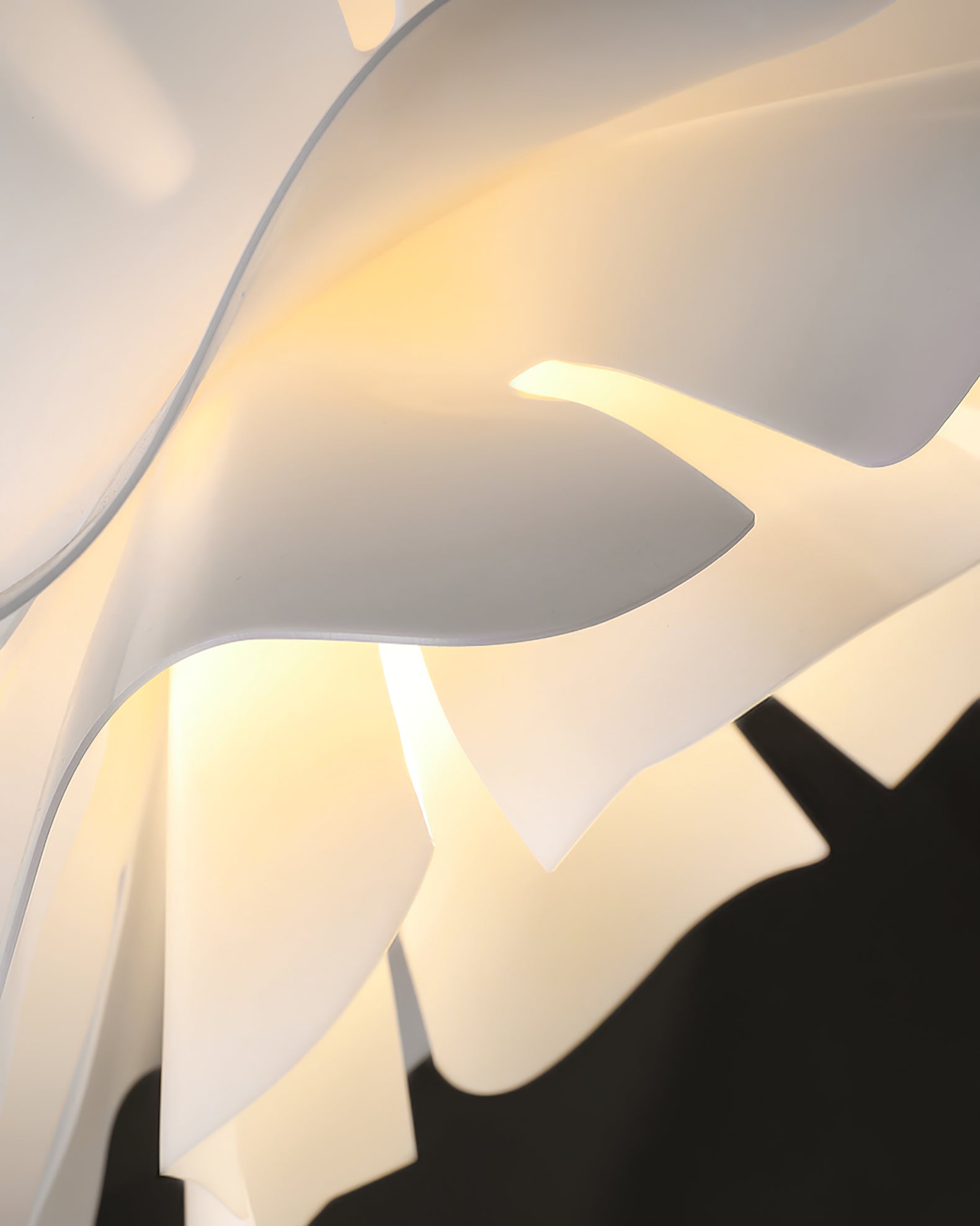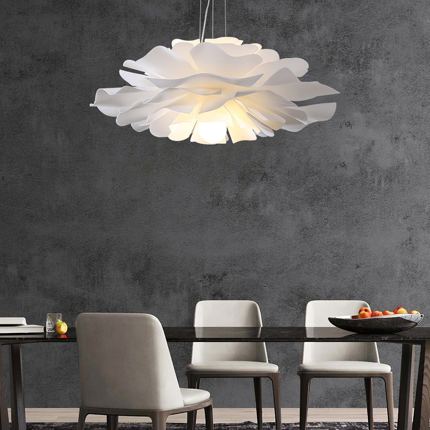 The Lotus Flower Pendant Lamp will instantly draw your attention with its lotus-like shape and captivating design. Its warm white finish provides a calming atmosphere, like a cloud floating in the sky. Perfect for any modern living space.