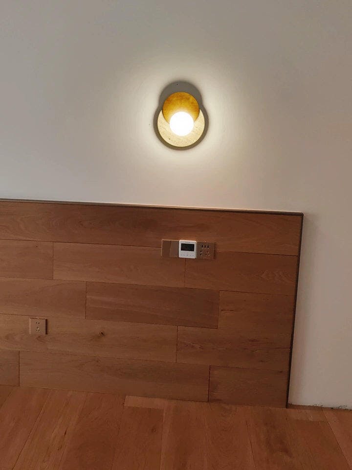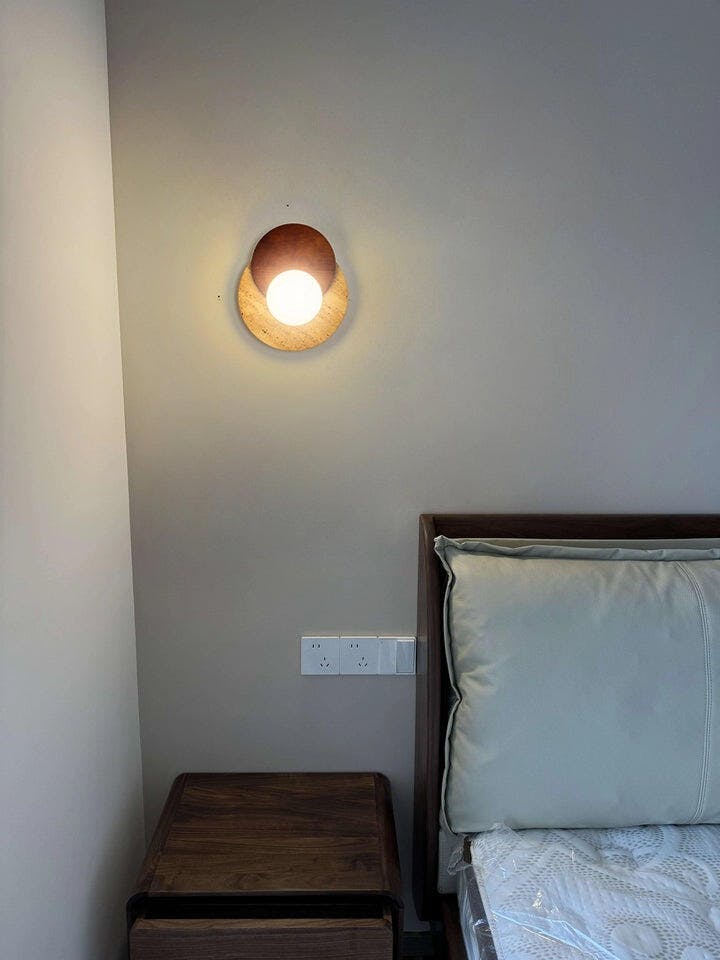 Lunar Eclipse Travertine Wall Lamp, Featuring a mesmerizing design of yellow travertine and warm wood, this lamp creates the perfect ambiance with its soft, ambient light. Add a touch of sophistication to your decor with this modern and artistic piece.