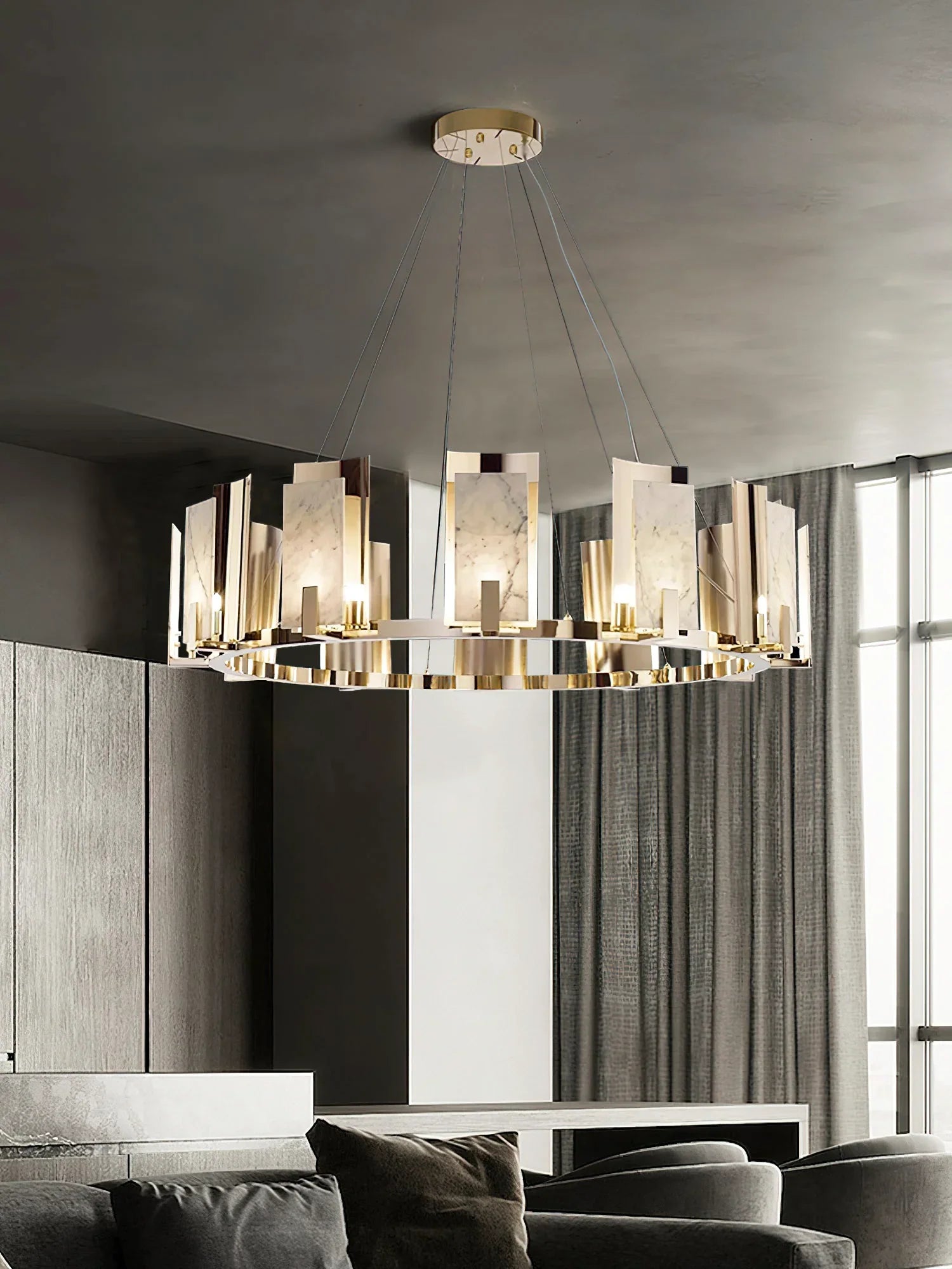 It highlights the focal point of our home's decor. It draws the eye upward, making the whole room feel more grand. Very happy with the look. It's modern, stylish, and provides us with wonderful light.