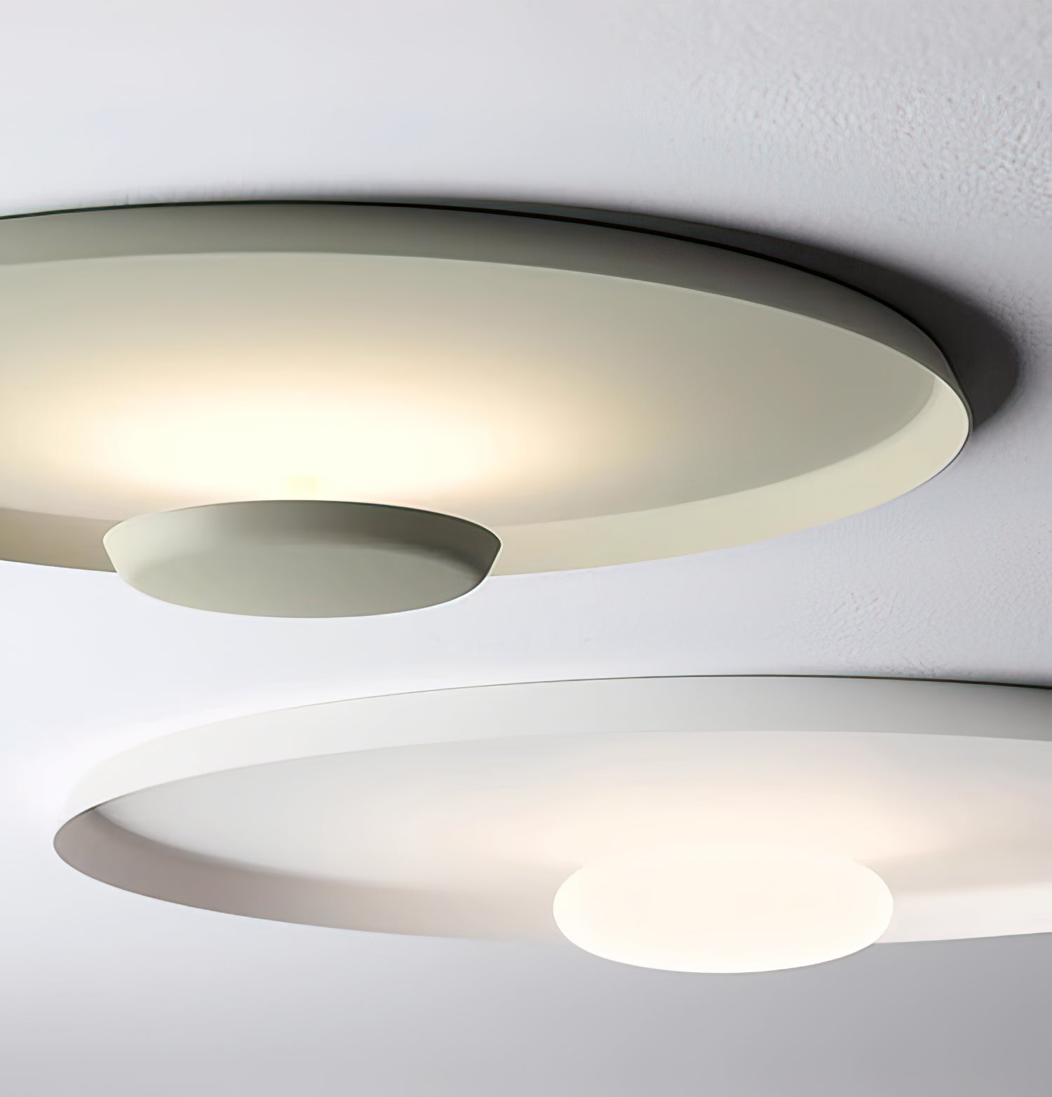 OLEV Overfly Plus Ceiling Light is small central sphere reflects the light towards a larger surrounding ring generating a halo type effect of even and indirect lighting and creating a relaxed ambience. The light appears to be framed within its own diameter, its attractive and minimalist design doubles as a piece of abstract wall art.